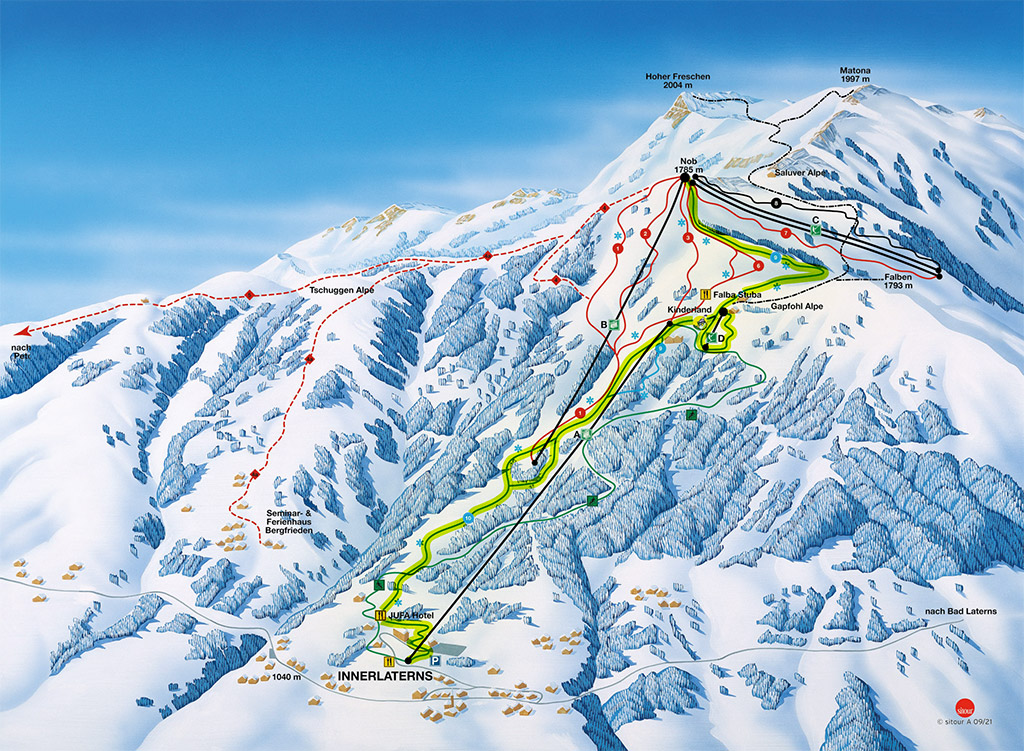 Das Laternsertal mit seinen Ortschaften Laterns-Thal, Bonacker und Innerlaterns ist ein Seitenarm des Vorarlberger Oberlandes. Das Skigebiet Laterns-Gapfohl bietet auf 27 Pistenkilometern mit zwei Sesselbahnen, zwei Schleppliften, einem Übungslift und einem Zauberteppich für nahezu jede Herausforderung den passenden Schwierigkeitsgrad. Von Übungshängen über Familien- und Tourenabfahrten bis hin zu Abfahrtsvarianten für besonders Sportliche. Familien schätzen die gute Übersichtlichkeit des Gebiets, bei der die Kleinen stets im Blickfeld bleiben. Die Förderkapazität von 9.000 Personen/Stunde garantiert nahezu ‚staufreie‘ Skitage. Leistungsstarke Schneekanonen mit eigenem Speichersee sorgen dafür, dass sich die Pisten winterlich weiß präsentieren. Eine vier Kilometer lange Rodelbahn rundet das sportliche Angebot ab. Alle Pisten sind mit dem Vorarlberger Pistengütesiegel ausgezeichnet.